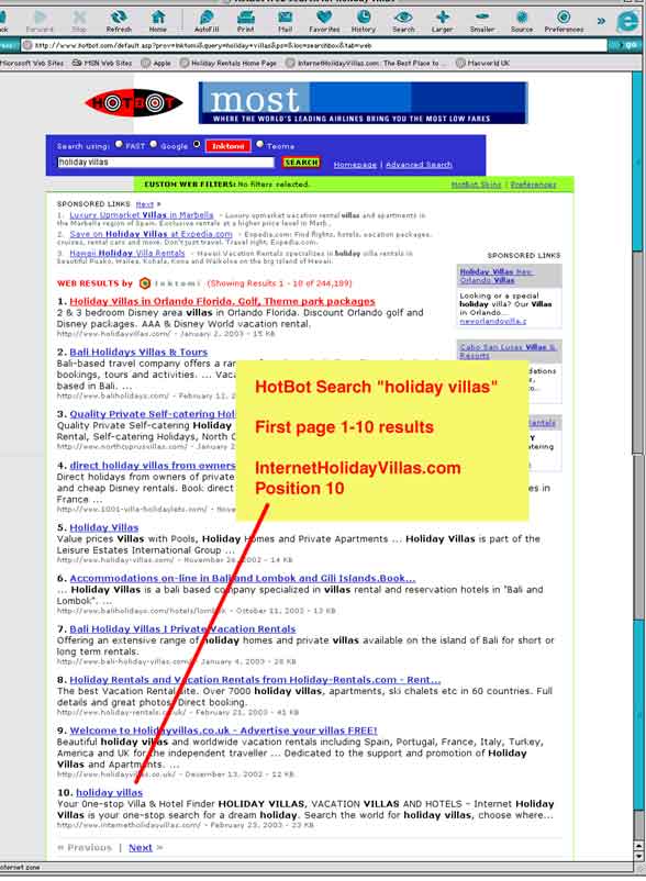 Image shows InternetHolidayVillas.com in 10th place on HotBot first page results for search "holiday villas" - screenshot taken March 1st 2003