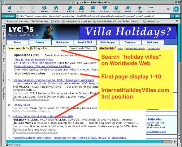 Image shows InternetHolidayVillas.com in 3rd place link on Lycos World Wide first page results for search "holiday villas"- screenshot taken April 28th 2003
